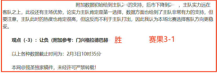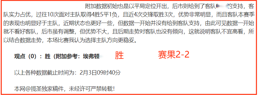 (温馨提示:观点回顾为已完场赛事的统计,并不能代表未来的观点预测结果走势,观点仅为其个人意见,与平.台无关。资讯仅供体育爱好者浏览,并不构成购.彩建议,任何人不得用于非法用途,请广大用户理性消费。)