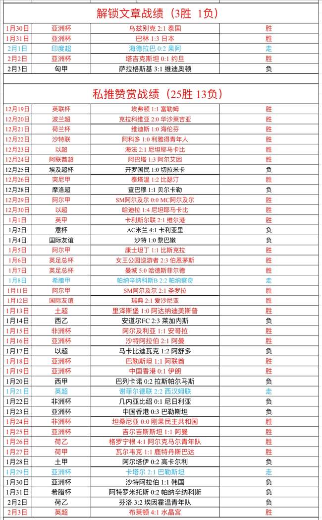 周六私推赞赏1场,英超布莱顿轻松大胜,我们完美全胜拿下,私推赞赏拿到25胜13负!解锁文章1场判断错误,被数据诱导,解锁文章3连胜被终结了!私推总进球数1场没有打出,数据判断错误,还需更加深刻研究!