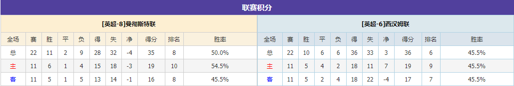 反观对手,“铁锤帮”西汉姆联目前在联赛22轮过后以10胜6平6负的战绩排名联赛第6,身处欧战区的他们与本轮的对手曼联仅差1分,随时有被对手反超的可能,因此球队在战意方面不容小觑。而值得提及到的是,铁锤帮在本赛季至今为止累计已经攻入了36粒进球,球队在进攻端方面的表现可圈可点。不过在本赛季作客的11轮赛事,西汉姆联只取得5胜2平4负的表现,异地作赛能力只能说中规中矩。