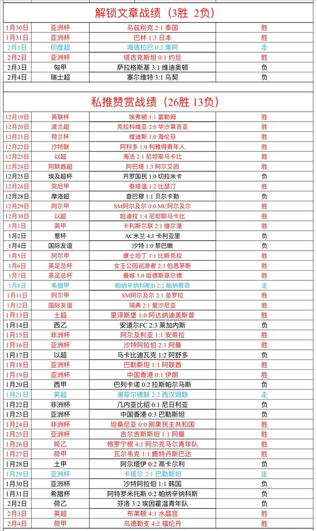 周日私推赞赏1场,荷甲乌德勒支轻松大胜,我们完美全胜拿下,私推赞赏拿到26胜13负!解锁文章1场判断错误,数据判断错误,解锁文章3胜2负!私推总进球数1场没有打出,差一个球,很可惜!
