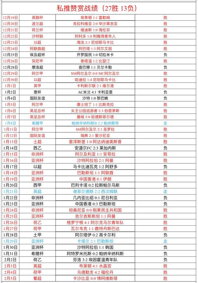 周一私推赞赏1场,葡超博阿维斯塔完美不败,我们完美全胜拿下,私推赞赏强势3连胜,拿到27胜13负!解锁文章1场数据判断错误,明显被诱导了!私推总进球数1场没有打出,数据判断有问题!