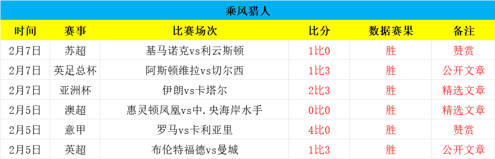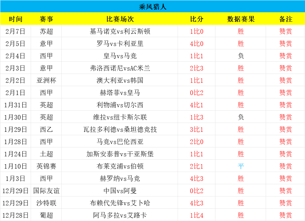 昨日三场又全胜+各项6连胜+近37场5负!精选亚.洲杯轰出5球,进球数全胜,而赞赏的苏超基马诺克成功取胜,公开英足总杯打出4球,进球数大捷,三场全胜,近各项6连胜+赞赏16场2负!近是极佳的状态,今日研究争取全胜,欢迎赞赏,再创佳绩!——今日重点参考乘胜追击!老铁们一起冲!