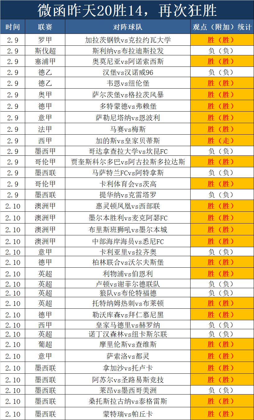 1、昨天再次狂胜,取下20胜14的成绩,另外澳洲甲有高光表现,4场大获全胜,还有墨西联,取下5胜4的熬人成绩,墨西联近25胜19,依然保持高效。