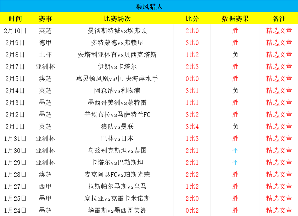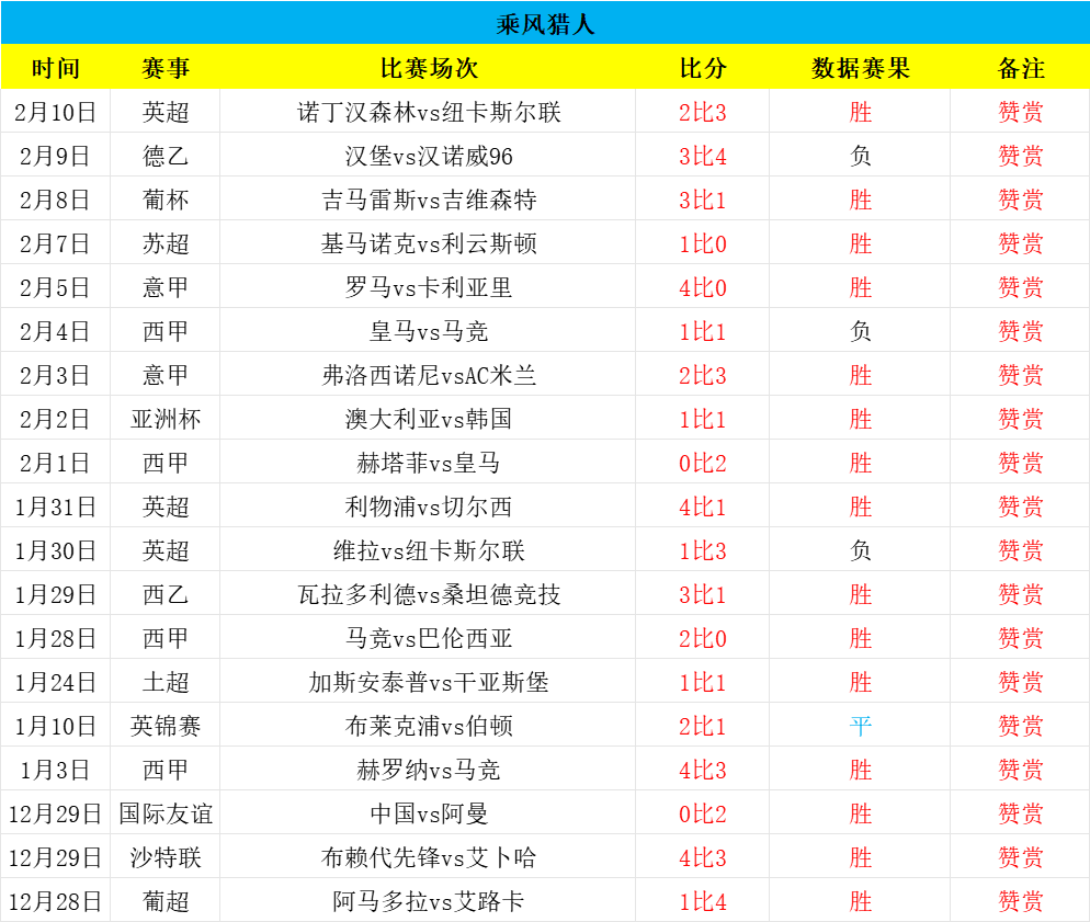 大家好,我是乘风猎人,职业数据分析师,足球经验丰富,研究足球数据数十载,期望能够乘风破浪,精准猎球制胜,欢迎朋友们长期关注!