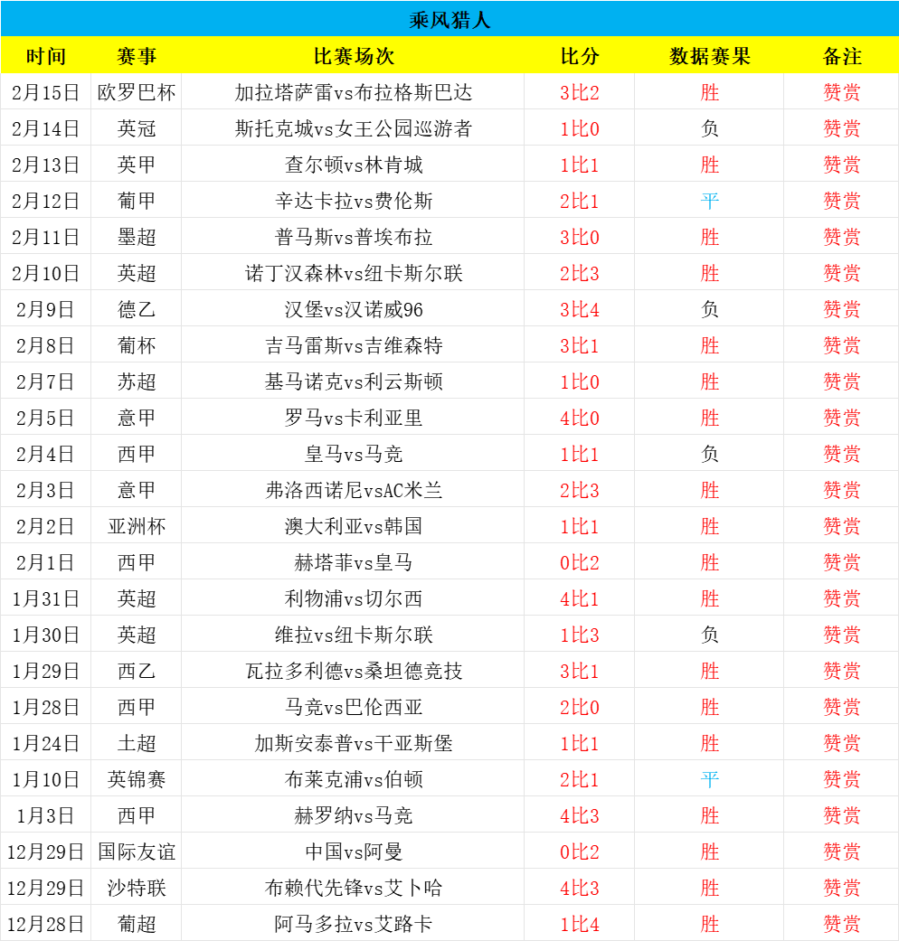 火热发挥,期待再创辉煌!状态十佳!各项赛事近来有连续15场不败12胜3平(1.24-1.30),状态火热,继续冲击新高,量少质高,欢迎解锁!