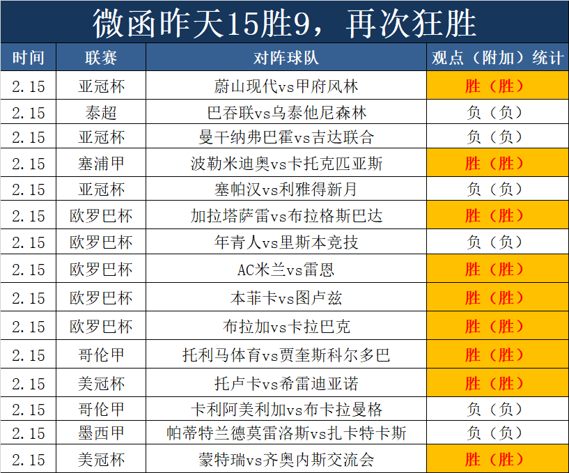 1、昨天再次狂胜,取下15胜9的战绩,其中欧罗巴取下5胜4的战绩,欧罗巴近期13胜10,欧罗巴杯的把握度依然非常高,今天澳甲+欧洲主流联赛,澳甲目前8连胜。