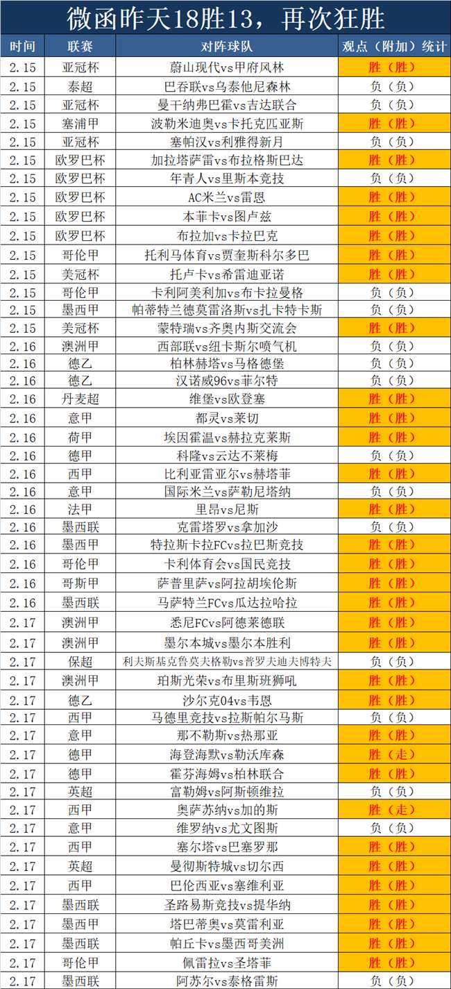 1、昨天又是狂胜,取下18胜13的成绩,20场建议仅失5,另外澳甲3场大获全胜,美洲联赛又是狂胜,取下5胜4的成绩,今天继续狂胜节奏。