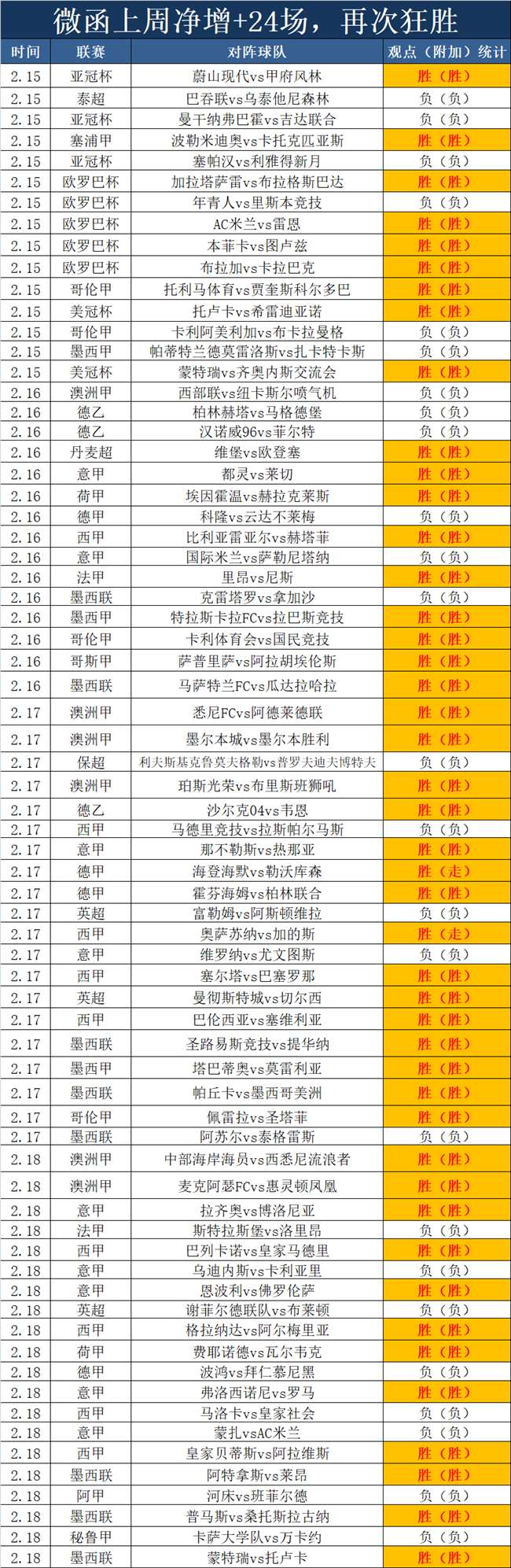 1、上周又是狂胜,上周净增+24场,连续多周狂胜,上周有高光表现的是澳洲甲,澳洲甲目前近14胜13,还有墨西联,墨西联目前近33胜25,本周继续狂胜节奏。