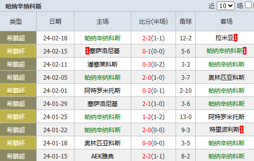 2、两队在樶近10次的交手记录当中,帕纳辛纳科斯4胜3平4负,略处上风。