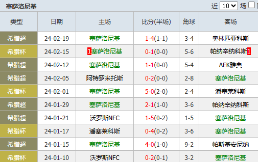 北京时间02月22日01点00分,23-24希腊杯半决赛次回合的一场比赛,塞萨洛尼基将前往客场与帕纳辛纳科斯展开较量。首回合帕纳辛纳科斯客场1-0击败对手占得先机,本次回归主场作战,他们更能从容应对。