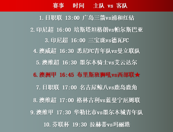 赛事前瞻:本文提供02月23日13时00分-19时30分时段的10场足球赛事走势分析表,当中包括日职联、印尼超、澳维超、澳洲甲等赛事提供分析参考,具备较高的参考价值。主要关注赛程如下: