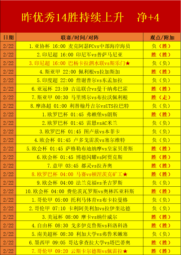 在过去的4个多月时间里,笔者合计已经取得连续14个优秀旬计划增长,在持续高产的同时保持着稳定优秀的数据击中能力,本日继续精选值得关注的主流精选赛程,争取在剩余的2月赛程里继续与大家朝向更高的数据峰值冲刺!