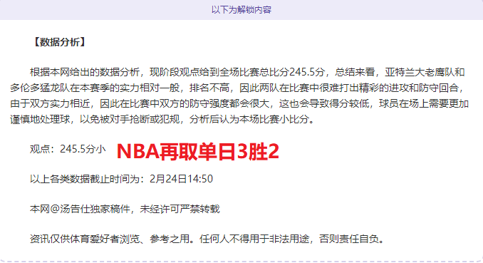 成绩回顾:作者在昨日赛事暂时拿下两胜,近期取得了4胜3战绩!近期一波长胜利也是深入人心,在篮球领域作者也是用心分析每一场比赛,为了胜利也是努力去奋斗,在近两年时间里面作者也是收获了多次的九连胜成绩,足以证明了作者的实力是不错的,在2024年作者继续戒骄戒躁的理念,全身心去力争每一场比赛分析是正确无误的!