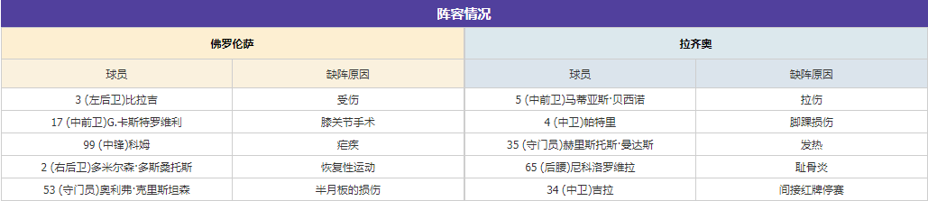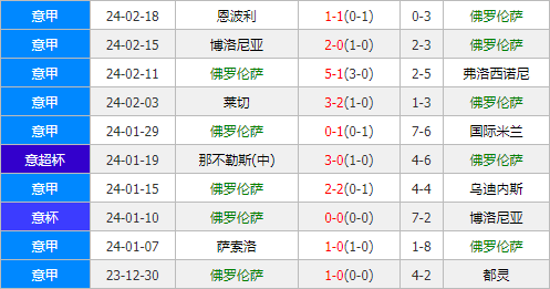 但在上轮作客对阵恩波利的比赛当中,紫百合则在全场赛事场面占优的情况下却被对手以1-1的比分逼平,中场核心贝尔特兰为球队攻入了首开纪录的进球,展现出极其不俗的竞技状态。不过在过去的9场各项赛事,佛罗伦萨只取得1胜3平5负的战绩,期间球队整体表现并不理想,此番回归主场能否止住颓势?