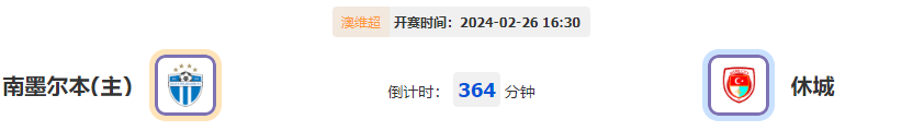 北京时间02月26日16:30,澳维超第3轮赛事南墨尔本vs休城,南墨尔本二连胜保持火热表现,他们能否在此役捍卫主场乘胜追击?休城境况不落下风,近期也未有丝毫减退,此番挑战是否已做好准备?