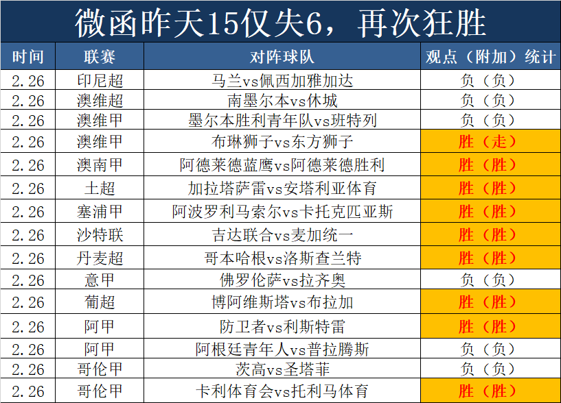 1、昨天再次狂胜,15仅失6场,昨天的欧洲赛事表现突出,只有1场失手,今天继续狂胜节奏。