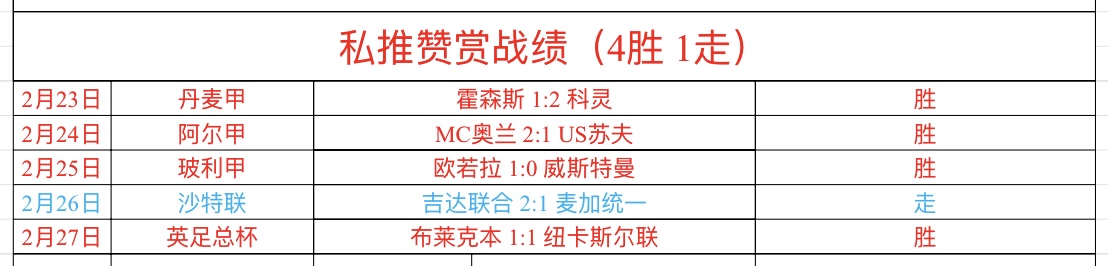 周一私推赞赏1场,英足总杯布莱克本强势战平纽卡斯尔联,我们私推赞赏强势拿到4连胜!解锁文章1场,芬联杯拉赫蒂轻松大胜赫尔辛基,解锁文章成功拿到胜利!私推总进球数1场没有打出,判断错误!