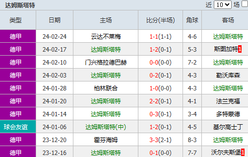 2、近期达姆斯塔特的作战局面依然没有明显改观,在上轮比赛客场战平云达不莱梅后,近6轮比赛下来,他们只是3平3负一胜难求。