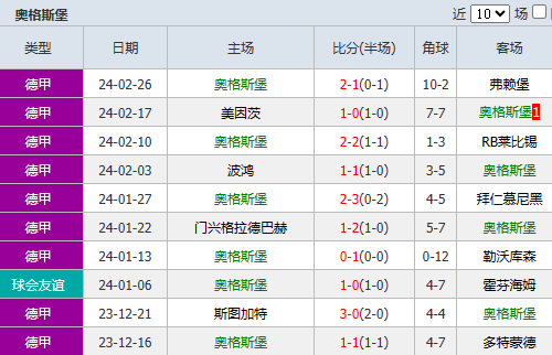 2、在两队本季此前9次的交锋当中,奥格斯堡5胜2平2负,处于上风。