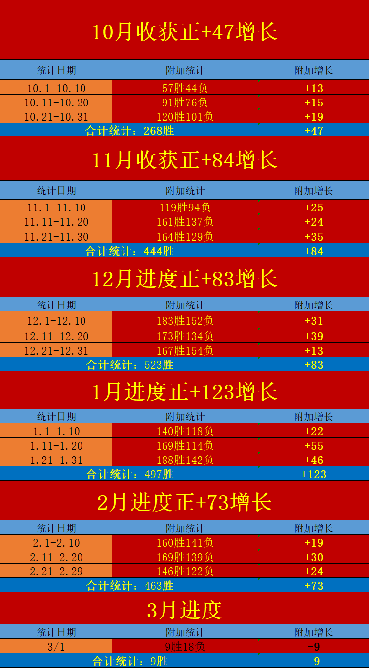 昨天已完成赛程拿下9场胜利,相比起笔者此前连续狂增的数据表现有所下滑,但在整段的赛程轨道上属于合理的调整范围,其中一些主流关键赛程的击中和部分欧赛的造冷值得给予足够的重视,本日重新调整对焦点赛程的数据摘选,对值得关注的赛程进行整合,争取尽快回到正向的增长轨道。在过去长达5个月的时间里,笔者交出了一个稳健且优秀的数据赛程表现,连续15个旬计划走向了精彩的正向增长轨道,合计为大家呈献了净+410场的精彩正向!保持对数据模块方向的信任,3月赛程重新出发!