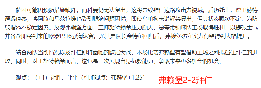 昨天的精选赛事成功拿下胜利!弗赖堡2-2拜仁,果然,内部已经奔溃,信不过了。弗赖堡成功捍卫主场,也捍卫了数据。今晚继续努力,争取更好成绩。