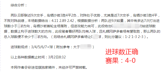 昨日4胜2战绩,日职联赛事:鸟栖沙岩主场4球完胜札幌冈萨多,进球数符合笔者预期;另外中超赛事:成都蓉城主场2球力克青岛海牛,比分方向完美打出。