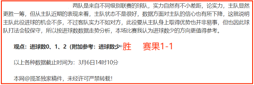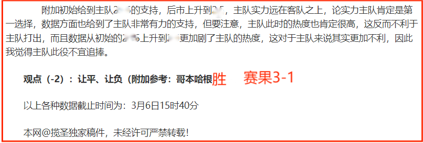 (温馨提示:观点回顾为已完场赛事的统计,并不能代表未来的观点预测结果走势,观点仅为其个人意见,与平.台无关。资讯仅供体育爱好者浏览,并不构成购.彩建议,任何人不得用于非法用途,请广大用户理性消费。)