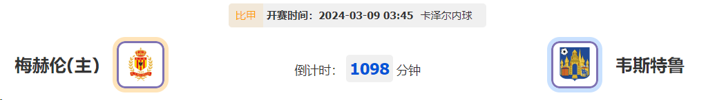 北京时间9月9日03:45,比甲第29轮,梅赫伦对阵韦斯特鲁。梅赫伦境况依旧显得十分稳定,此番回到主场能否利用优势,他们能否延续状态更胜一筹?韦斯特鲁表现与对手相反,如今挑战不失底气,球队此役能否如愿全身而退?