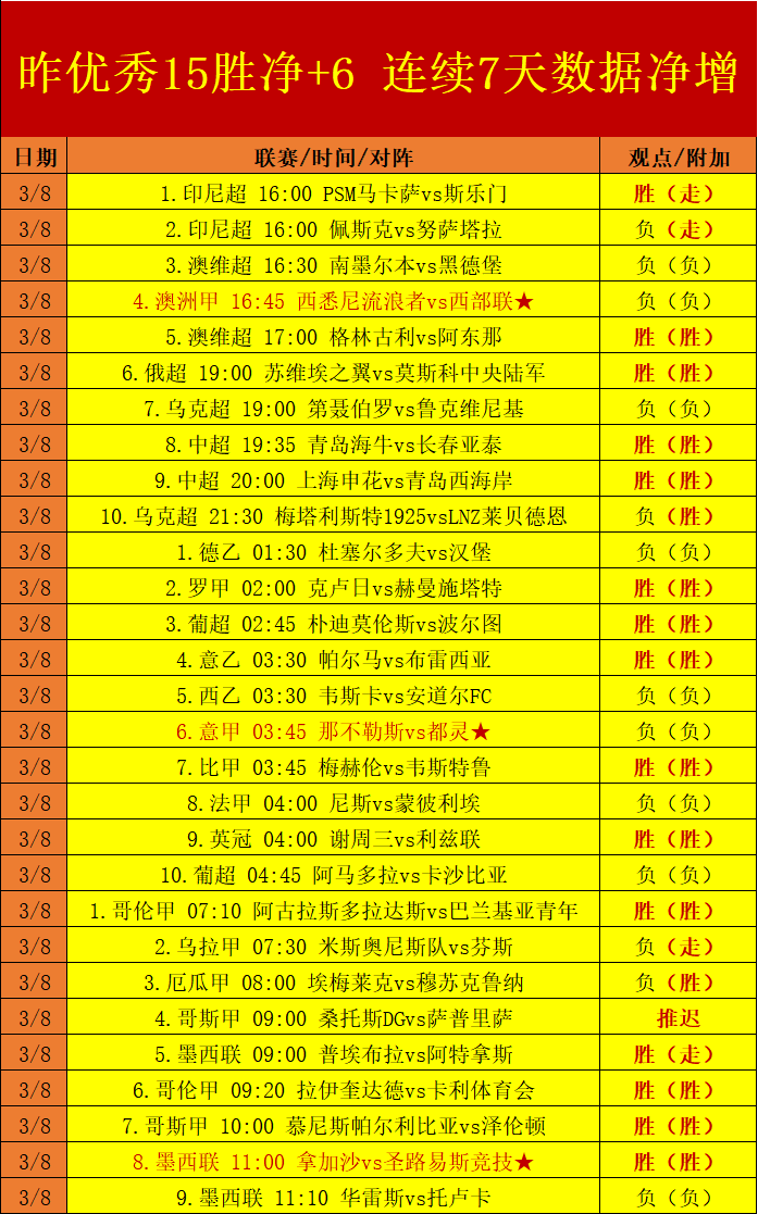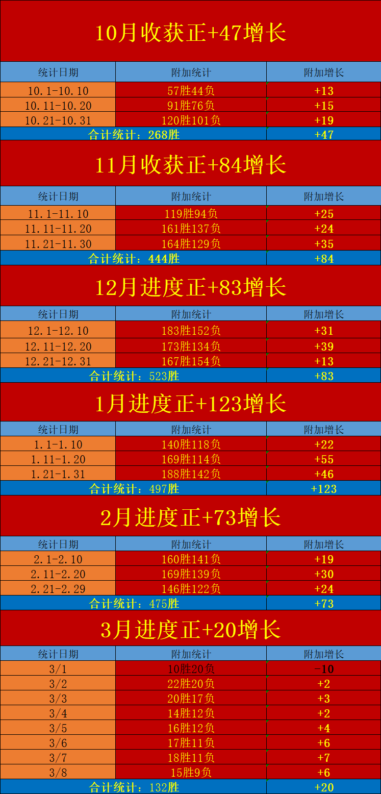 昨天完成赛程继续拿下15场优秀的胜利观点分享,单日进度取得净+6数据增长!交出的每一个精选板块均展现出了精彩的数据击中能力,3月上旬赛程计划连续7日时间取得正向的数据增长,净值狂+30!与笔者过去取得的15个连胜旬计划成功完成接驳,在过去的5个月时间里,笔者交出了15个稳定且优秀的连续旬计划数据增长,合计为大家带来的净+410的正向成绩,目前上旬进度调整完成重新回到了净+18的优质增长通道!继续保持对数据模块的信任,精选值得关注的焦点赛程进行组合冲刺,争取在3月上旬计划里想着更高峰值进行冲击!