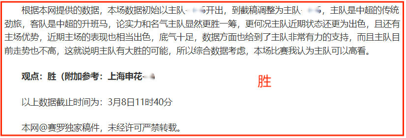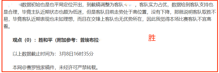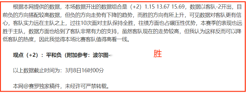 (温馨提示:观点回顾为已完场赛事的统计,并不能代表未来的观点预测结果走势,观点仅为其个人意见,与平.台无关。资讯仅供体育爱好者浏览,并不构成购.彩建议,任何人不得用于非法用途,请广大用户理性消费。)