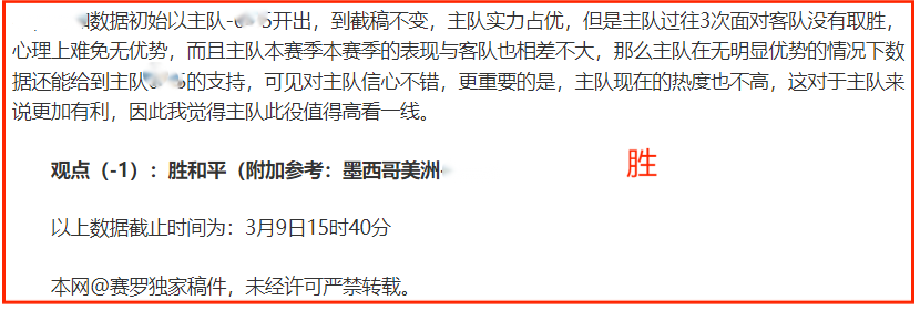 (温馨提示:观点回顾为已完场赛事的统计,并不能代表未来的观点预测结果走势,观点仅为其个人意见,与平.台无关。资讯仅供体育爱好者浏览,并不构成购.彩建议,任何人不得用于非法用途,请广大用户理性消费。)
