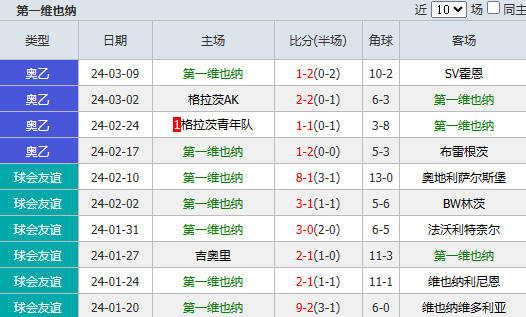2、在上场比赛主场1-2负于SV霍恩之后,近4场比赛下来,第一维也纳2平2负一胜难求。