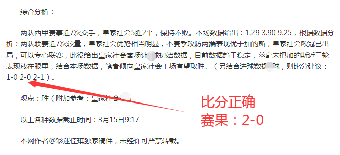 昨日3胜2战绩,德甲赛事:科隆主场1-5完败给RB莱比锡,进球数符合笔者思路;另外西甲赛事:皇家社会主场2-0零封加的斯,比分方向完美打出,值得一提的是西甲赛事近6场胜率百分百。