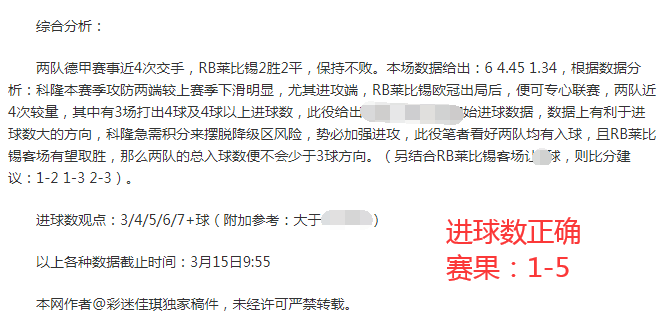 昨日3胜2战绩,德甲赛事:科隆主场1-5完败给RB莱比锡,进球数符合笔者思路;另外西甲赛事:皇家社会主场2-0零封加的斯,比分方向完美打出,值得一提的是西甲赛事近6场胜率百分百。