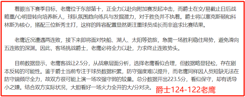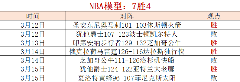 昨天的NBA模型:犹他爵士124-122亚特兰大老鹰,两队打出246分的大数据,胜利。NBA模型7胜4。今晚继续以NBA为主题,希望大家喜欢。