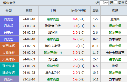 2、在上轮比赛主场0-1不敌奥胡斯后,锡尔克堡遭遇联赛4连败。
