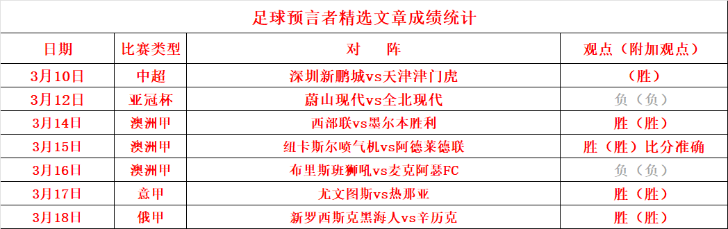 (温馨提示:观点回顾为已完场赛事的统计,并不能代表未来的观点预测结果走势,观点仅为其个人意见,与平.台无关。资讯仅供体育爱好者浏览,并不构成购.彩建议,任何人不得用于非法用途,请广大用户理性消费。)