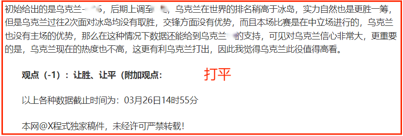 (温馨提示:观点回顾为已完场赛事的统计,并不能代表未来的观点预测结果走势,观点仅为其个人意见,与平.台无关。资讯仅供体育爱好者浏览,并不构成购.彩建议,任何人不得用于非法用途,请广大用户理性消费。)