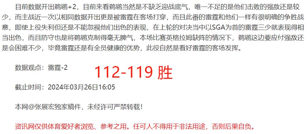 (温馨提示:观点回顾为已完场赛事的统计,并不能代表未来的观点预测结果走势,观点仅为其个人意见,与平.台无关。资讯仅供体育爱好者浏览,并不构成购.彩建议,任何人不得用于非法用途,请广大用户理性消费。)