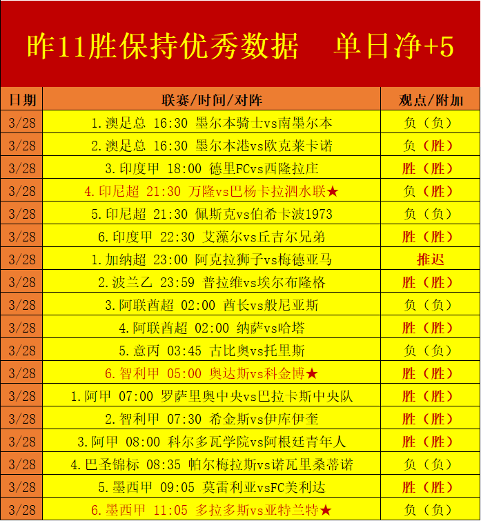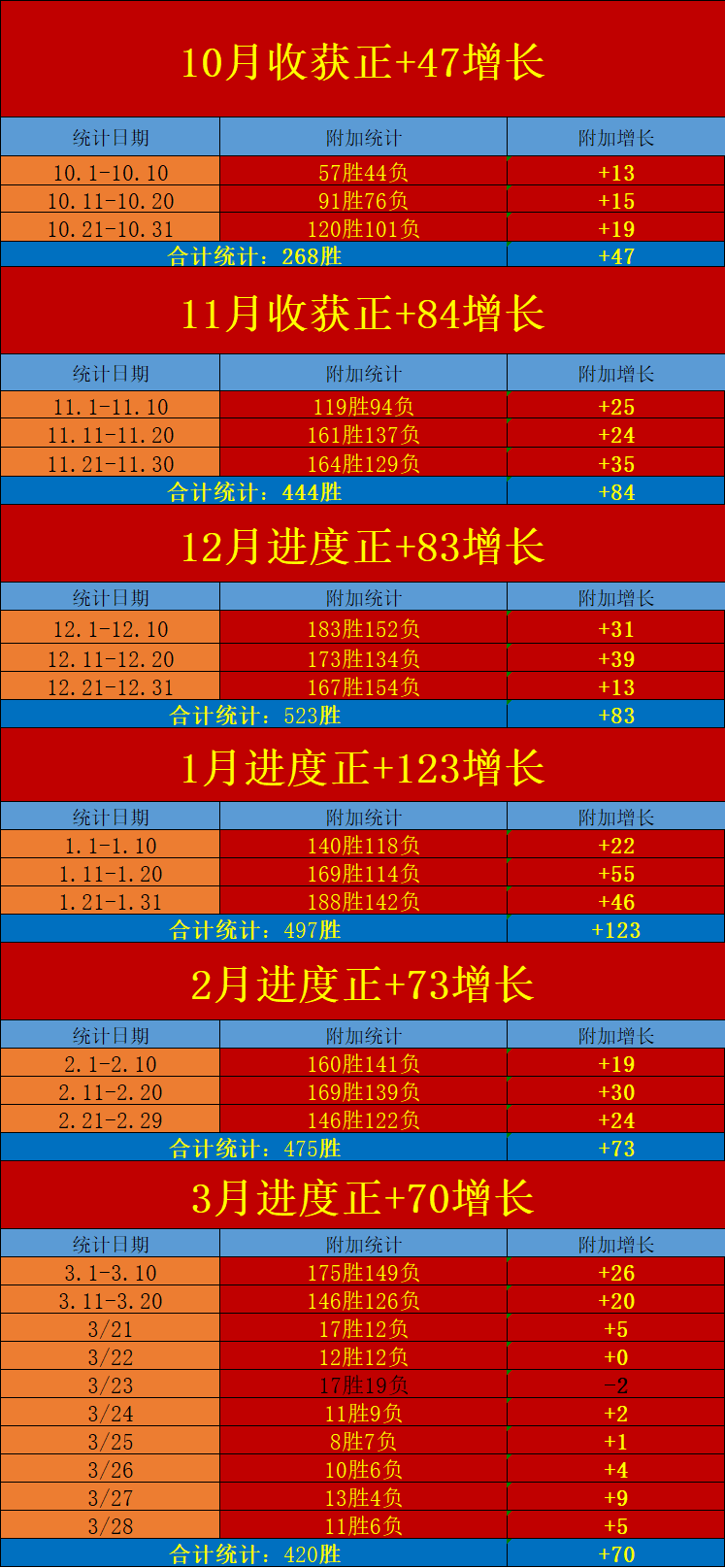 昨天已完成赛事拿下11场优秀的胜利观点,单日取得净+5的正向数据增长,各个板块均保持着优秀的数据击中能力!3月下旬计划继续朝着稳定的上升数据发展!截止到目前为止,数据模块3月合计产出420场胜利观点并从中转化出优质的净+70正向增长!笔者预期的第18个胜利旬计划近在眼前,在过去近半年的时间里,笔者合计拿下了17个胜利旬计划增长表现,继续精选值得关注的焦点赛程组合,争取在3月余下赛程日里与大家携手冲击更高峰值!