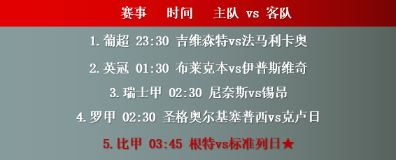 5. 根特vs标准列日,根特本赛季以进球净值的优势进入到了争冠组比赛,主场制胜能力一般的他们对上作客能力有限的标准列日,对于球队来说是一个宝贵的得分机会,但作客的标准列日在3月初主场曾有过4:2战胜根特的强势表现,今晚的作客对赛会再一次对根特防线造成连续性的冲击吗?
