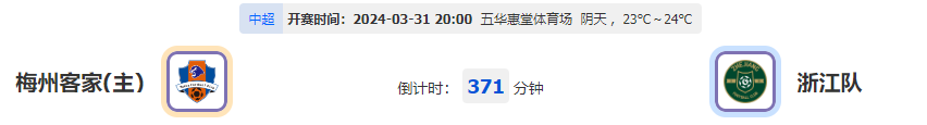 北京时间03月31日20时00分,中超2023-2024赛季第3轮比赛,梅州客家vs浙江队,主队开局连番不胜的成绩使得士气方面减退不少,本次主场迎战此前在上游保持稳定表现的浙江队,能否顺利捍卫主场重新抢分抢胜?让我们拭目以待!