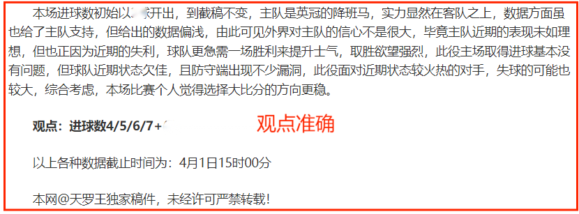 (温馨提示:观点回顾为已完场赛事的统计,并不能代表未来的观点预测结果走势,观点仅为其个人意见,与平.台无关。资讯仅供体育爱好者浏览,并不构成购.彩建议,任何人不得用于非法用途,请广大用户理性消费。)