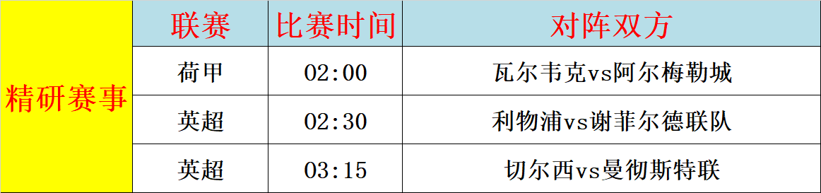 3、切尔西vs曼彻斯特联:切尔西目前联赛11胜7平10负,排名第11,在中游区,曼彻斯特联目前联赛15胜3平11负,在联赛第6,处在联赛上游,切尔西争取欧战区的希望渺茫,曼联还是有希望的,本场豪门对决,会擦出什么火花。
