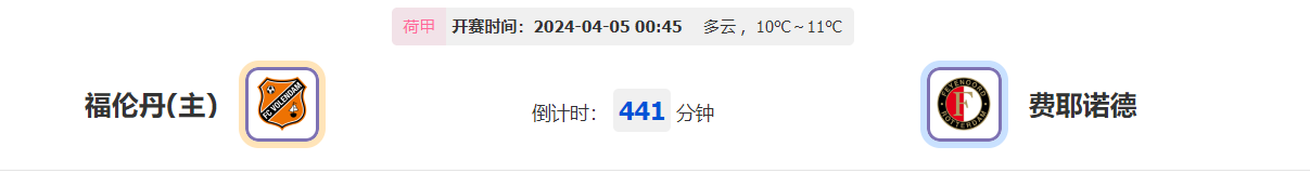 北京时间04月05日00:45,荷甲联赛第28轮,对阵双方分别是主场身份的福伦丹和客场身份的费耶诺德,福伦丹还是一胜难求的尴尬处境,他们能否在本场反弹上升,费耶诺德状态相反正是势如破竹,而且交战历来都处上风,本场是轻松完成反客为主?
