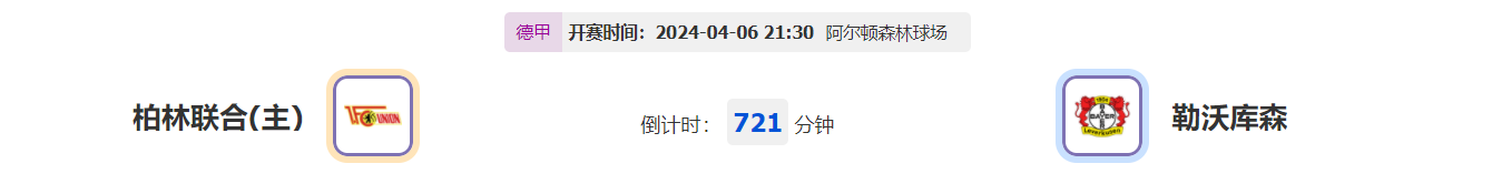 看点:柏林联合近期连续2场比赛不败,此役主场对阵榜首勒沃库森能否拿到积分?勒沃库森近期取得各项赛事5连胜,此役作客能否延续胜轨?
