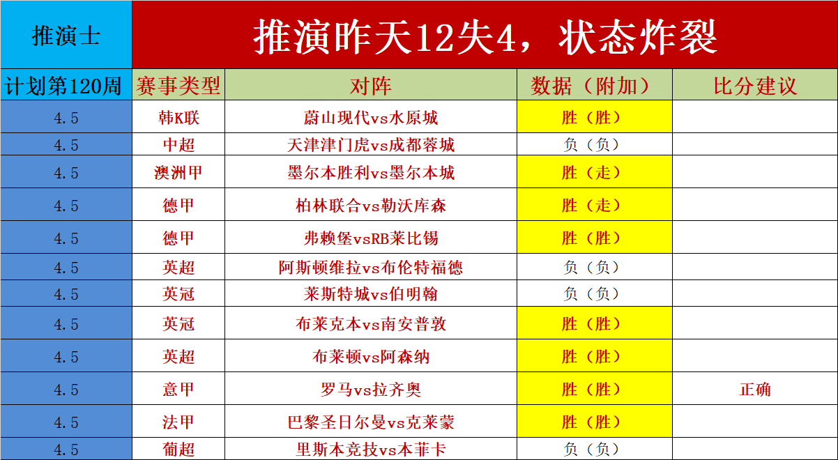 2、推演士计划第119周(走不纳入统计)再次完美结束,净增长+3,上周预测15场比分正确,持续的保持了高效的稳定。