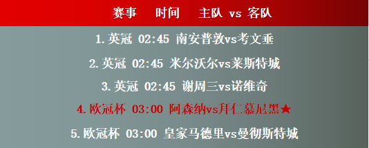 4. 阿森纳vs拜仁慕尼黑,阿森纳英超赛季15轮主场比赛取得12胜2平得分表现,攻守端数据发挥十分优秀,本轮欧冠主场迎战对手是德甲劲旅拜仁慕尼黑,后者赛季14轮作客比赛取得8胜2平得分表现,攻守端数据发挥比较优秀,并非容易拿捏的弱旅。