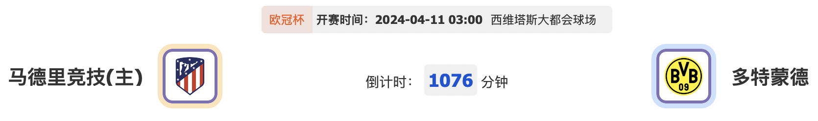 北京时间4月11日凌晨03:00,欧冠1/4决赛首回合的比赛将会继续展开,马竞队将会在主场迎来多特队的挑战,球队能否在主场顺利拿下3分呢?