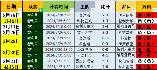 6、智利大学近期表现出色,10战7胜2平,目前积分处于榜首的位置!科金博近期表现不错,10战7不败,目前积分处于中上位置!那么此战谁能得分?